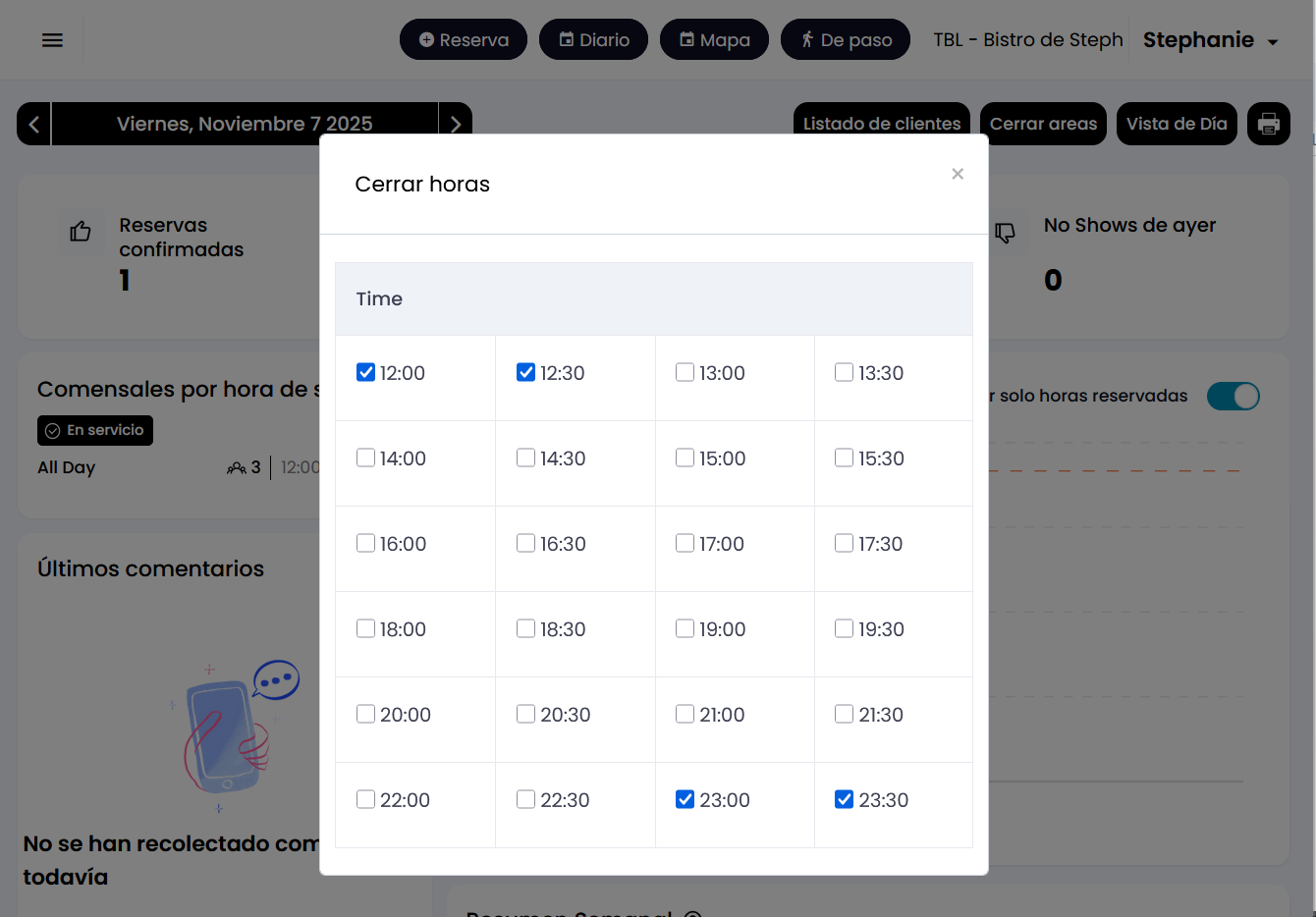 4. Al seleccionar ‘Areas de servicio’, puede detener las reservas para horas específicas en las zonas de comedor designadas.
