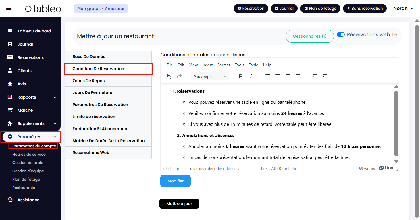 1. Cliquez sur Paramètres > Paramètres du compte > Conditions De Réservation.