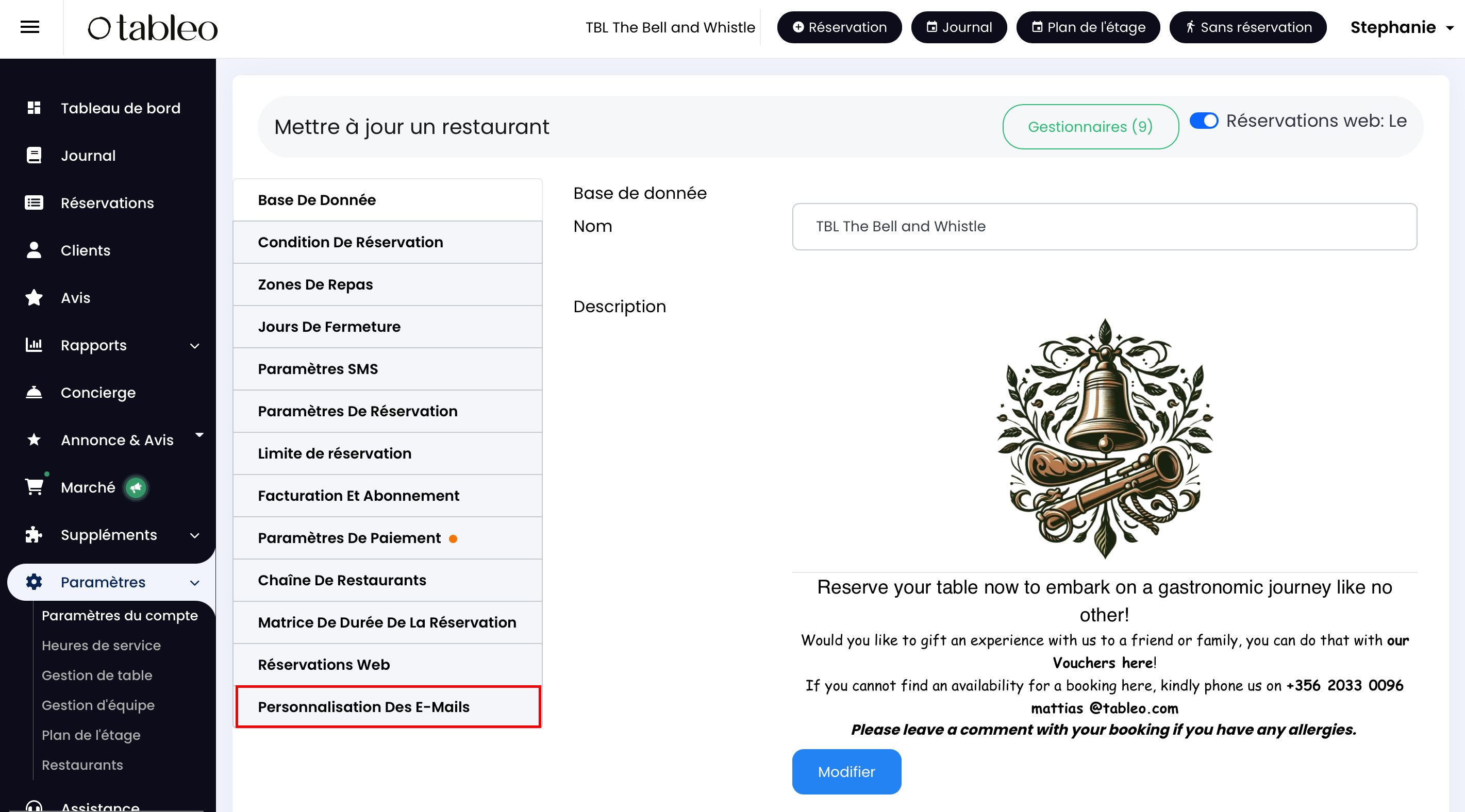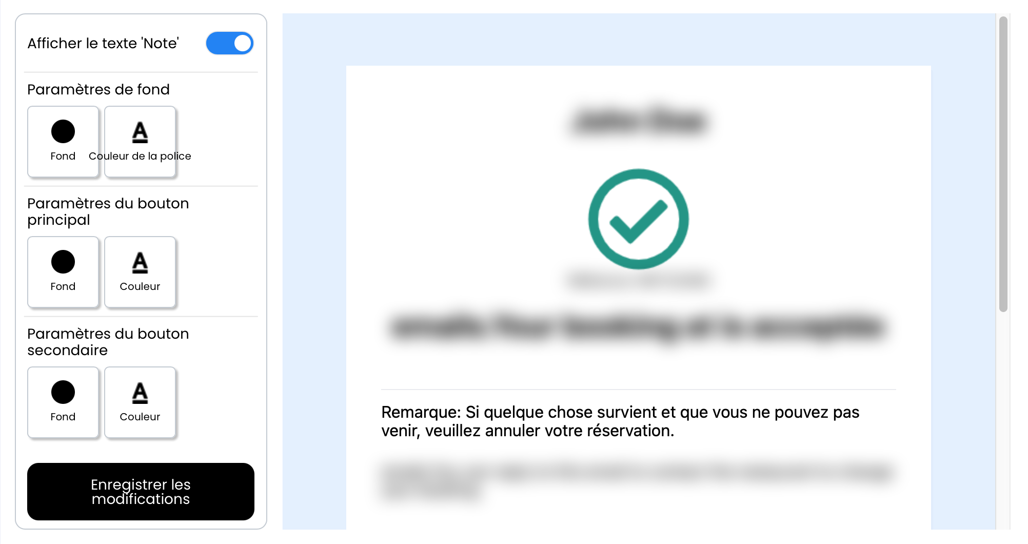 Avec Tableo, vous pouvez personnaliser les e-mails de confirmation et les rappels envoyés automatiquement à vos clients ou en interne, à vos responsables de restaurant, afin qu'ils reflètent pleinement votre marque.