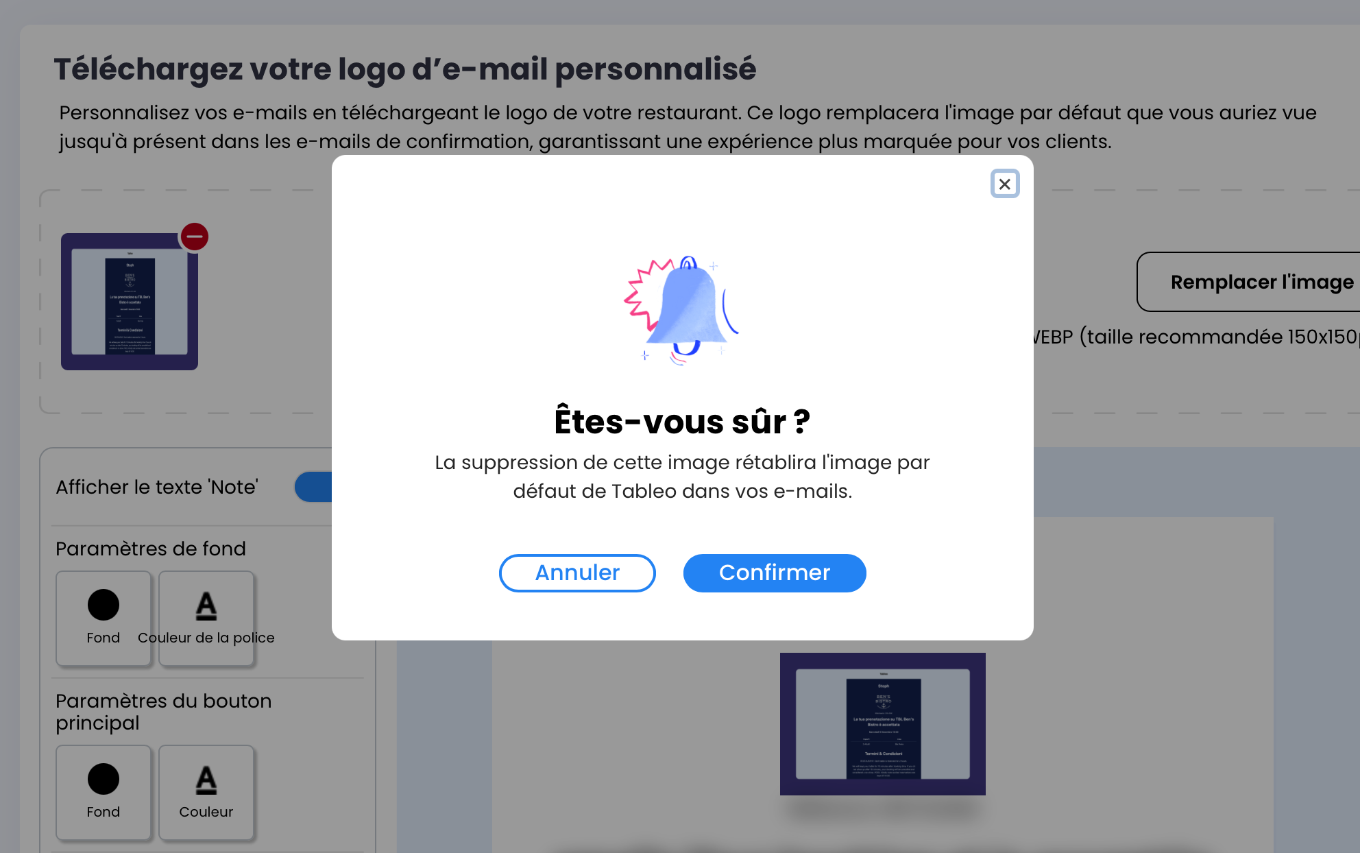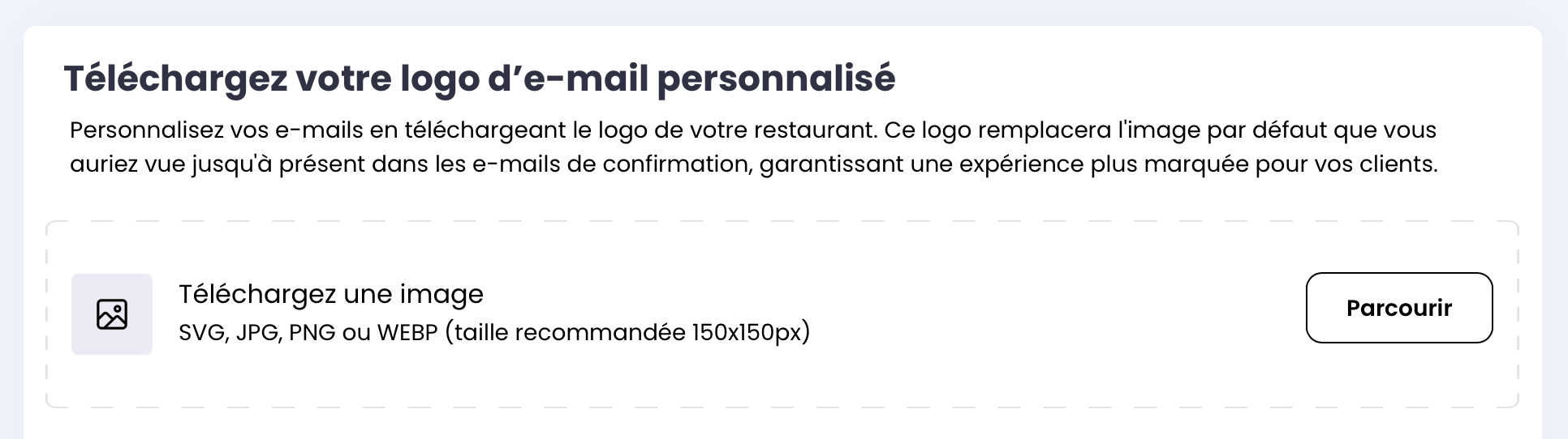 En téléchargeant votre logo, vous remplacerez le logo Tableo par défaut qui apparaît dans vos e-mails sortants. Vous serez invité à confirmer avant de le remplacer.